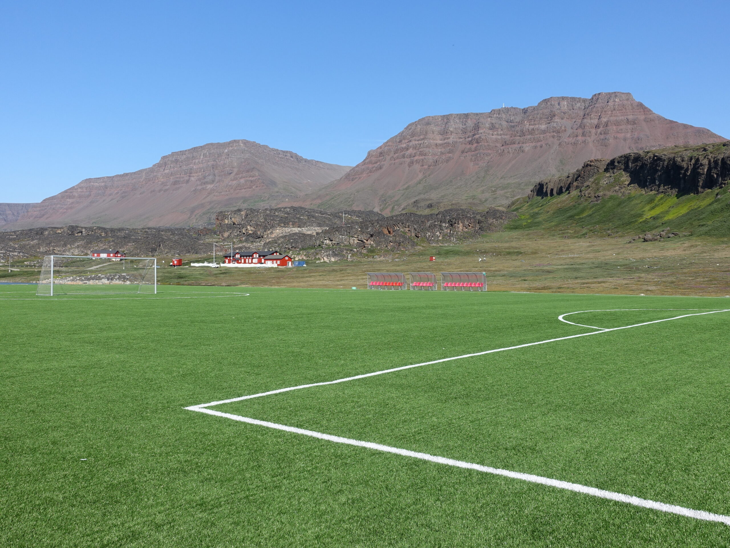 On my way out of town, I was keen to check out Qeqertarsuaq’s little ‘stadium’ on the beach. Arguably the most stunning football pitch in the world, it is flanked by a small black sand bay holding stranded icebergs and massive red table mountains.
