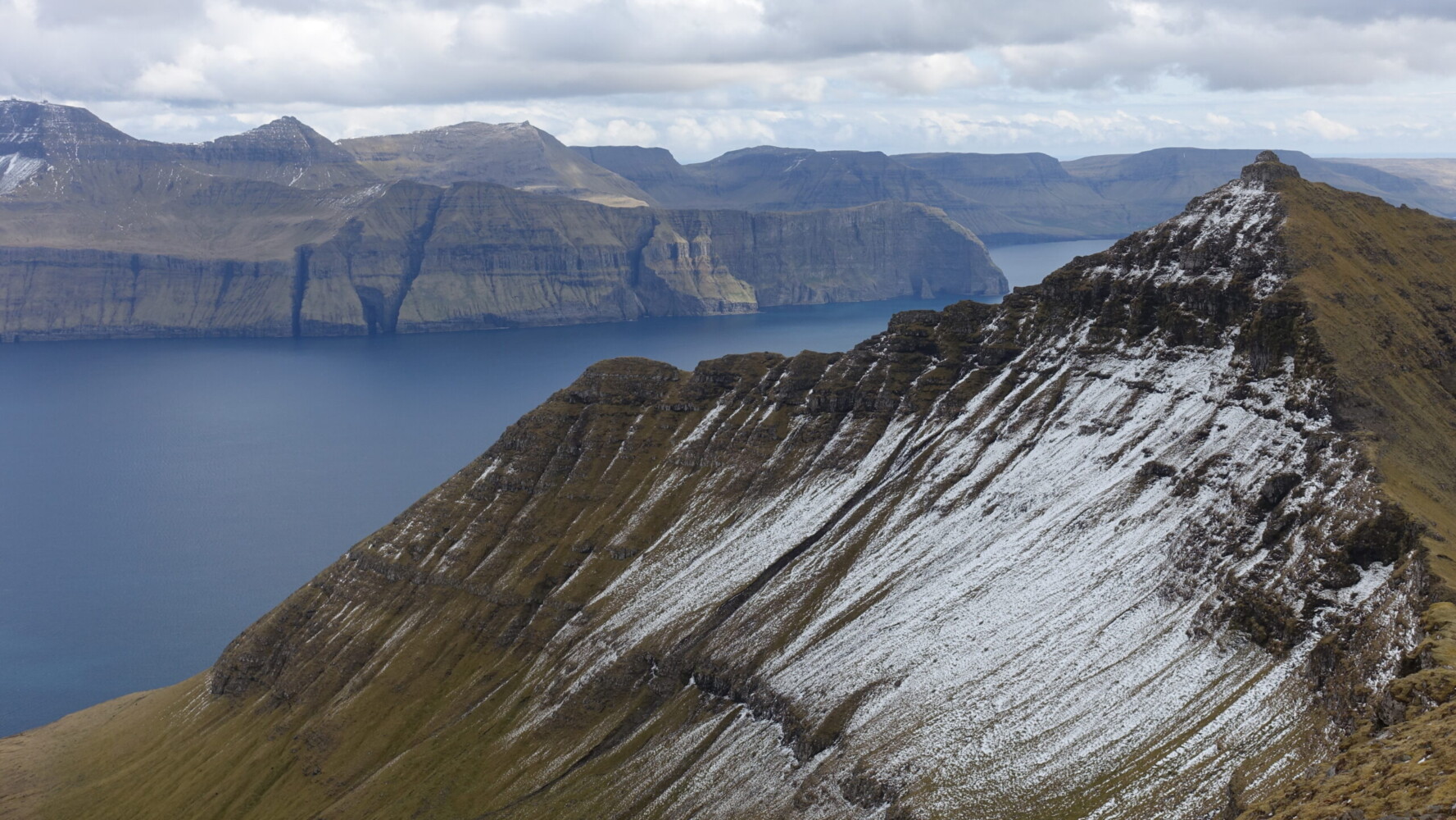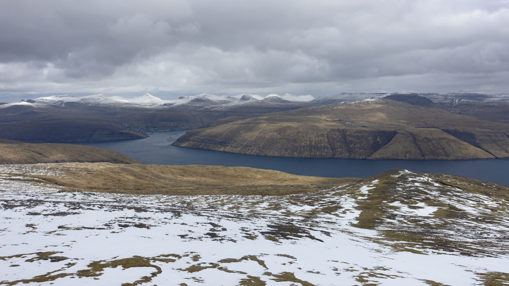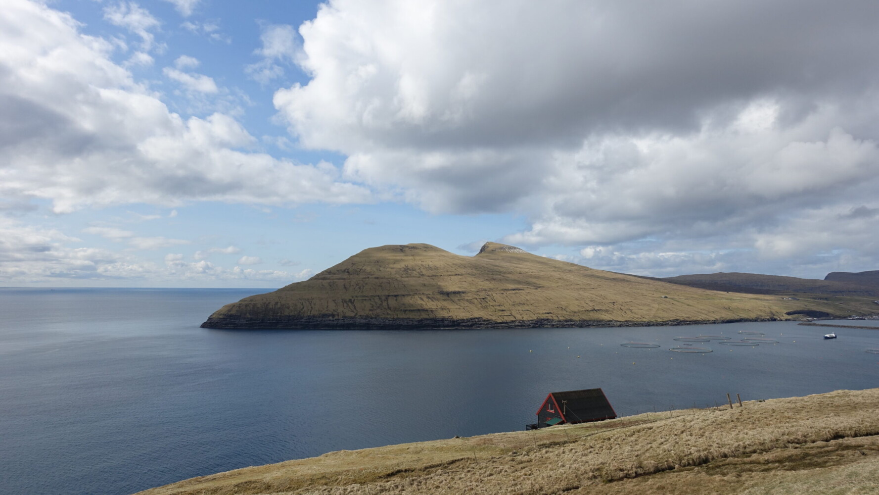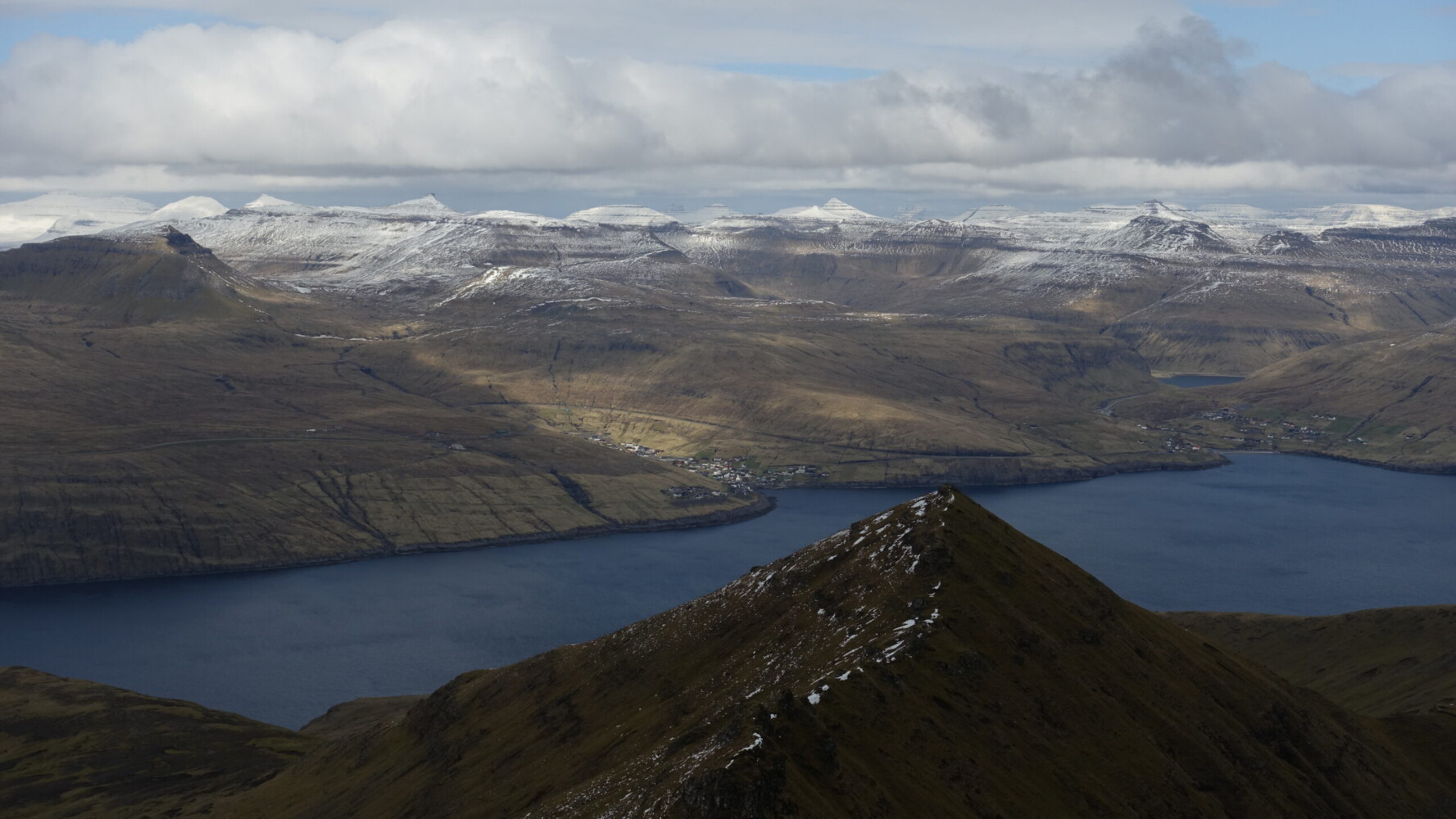 After a considerably descent, we topped Malinstindur and our views were redirected to across Vestmannasund and toward a gentler side of Streymoy’s topography.