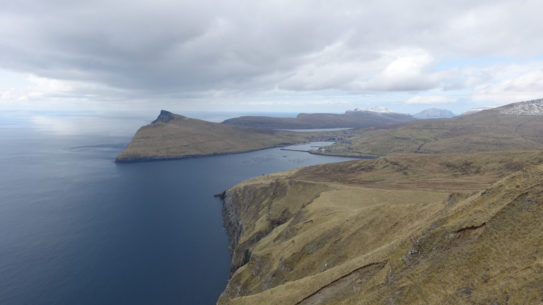 At Sandvágur’s Trøllkonufingur viewpoint, we hopped the fence and headed up. From Krosstindur and Húsafelli, the first two fells, we had exceptional views of Streymoy’s cliffs.